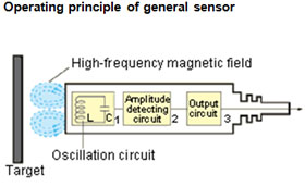 A high-frequency magnetic field is generated by coil L in the oscillation circuit. When a target approaches the magnetic field, an induction current (eddy current) flows in the target due to electromagnetic induction. As the target approaches the sensor, the induction current flow increases, which causes the load on the oscillation circuit to increase. Then, oscillation attenuates or stops. The sensor detects this change in the oscillation status with the amplitude detecting circuit, and outputs a detection signal. |